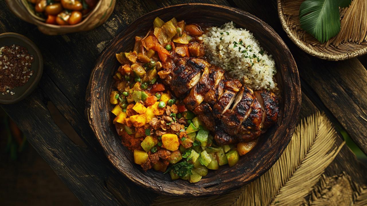 Le poulet grillé constitue l'accompagnement classique de l'Amiwo, créant une association harmonieuse entre la viande juteuse et la pâte rouge onctueuse. La chair du poulet ayant mijoté avec les aromates s'imprègne de saveurs qui se marient parfaitement avec celles de la préparation à base de farine de maïs. Cette combinaison représente l'archétype du repas festif béninois, celui que l'on sert lors des grandes occasions familiales et communautaires.